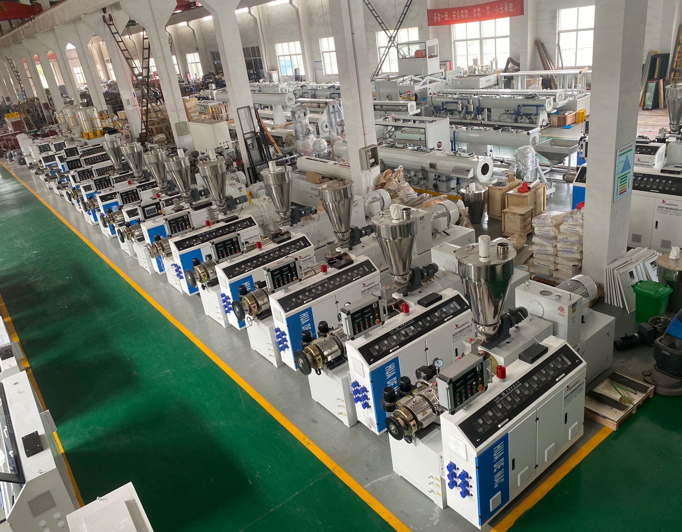 專業制造:系列單雙螺桿擠出機、PPR管材生產線、PVC給水/排水管材生產線、HDPE管材生產線、MPP/CPVC電力管生產線、PVC各類異型材等成套擠出生產線及干燥機、上料機、破碎機、擴口機、高速混合機、牽引機、磨粉機等系列塑料機械。